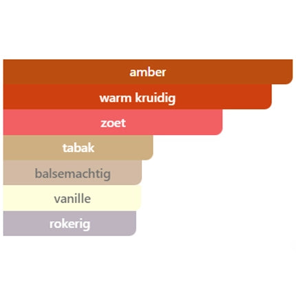 Deze geur draagt de sfeer van avondlicht, vuur en luxe samen — denk aan een elegante, warme avond omhuld in mysterie en allure.