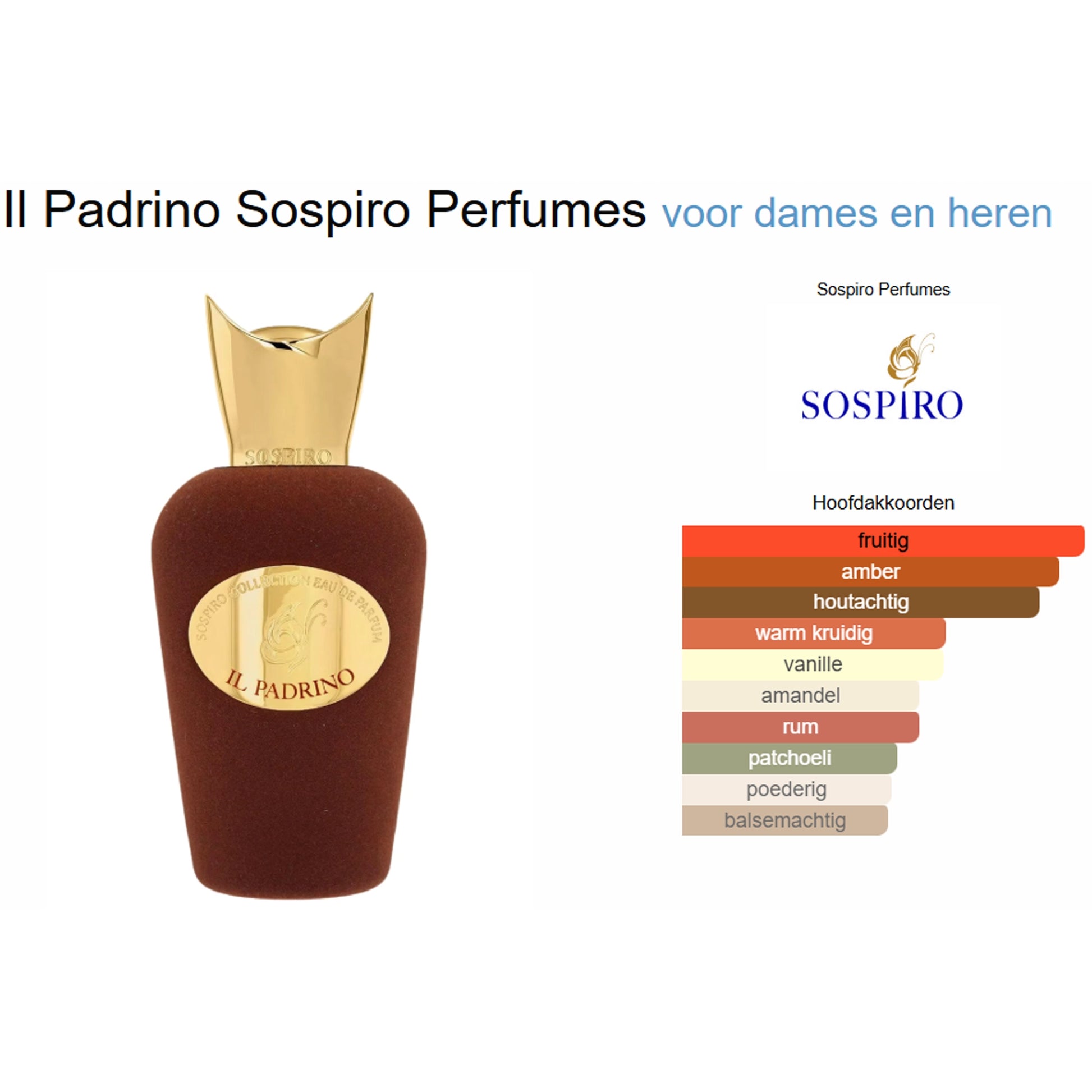 Il Padrino van Sospiro Perfumes is een parfum dat grandeur en verfijning combineert in één rijke, expressieve compositie. Het voelt als een Italiaanse meesterwerk-creatie: warm, krachtig en vol karakter, maar altijd met een gevoel van stijl en finesse. Deze geur is voor de drager die van betekenisvolle, diepe parfums houdt — een geur die blijft hangen in herinnering, aanwezigheid en elegantie.