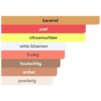 De basis is zacht, warm en sensueel. Vanille versterkt de gourmandbeleving, terwijl houttonen en musks zorgen voor diepte en een elegante, langdurige finish.